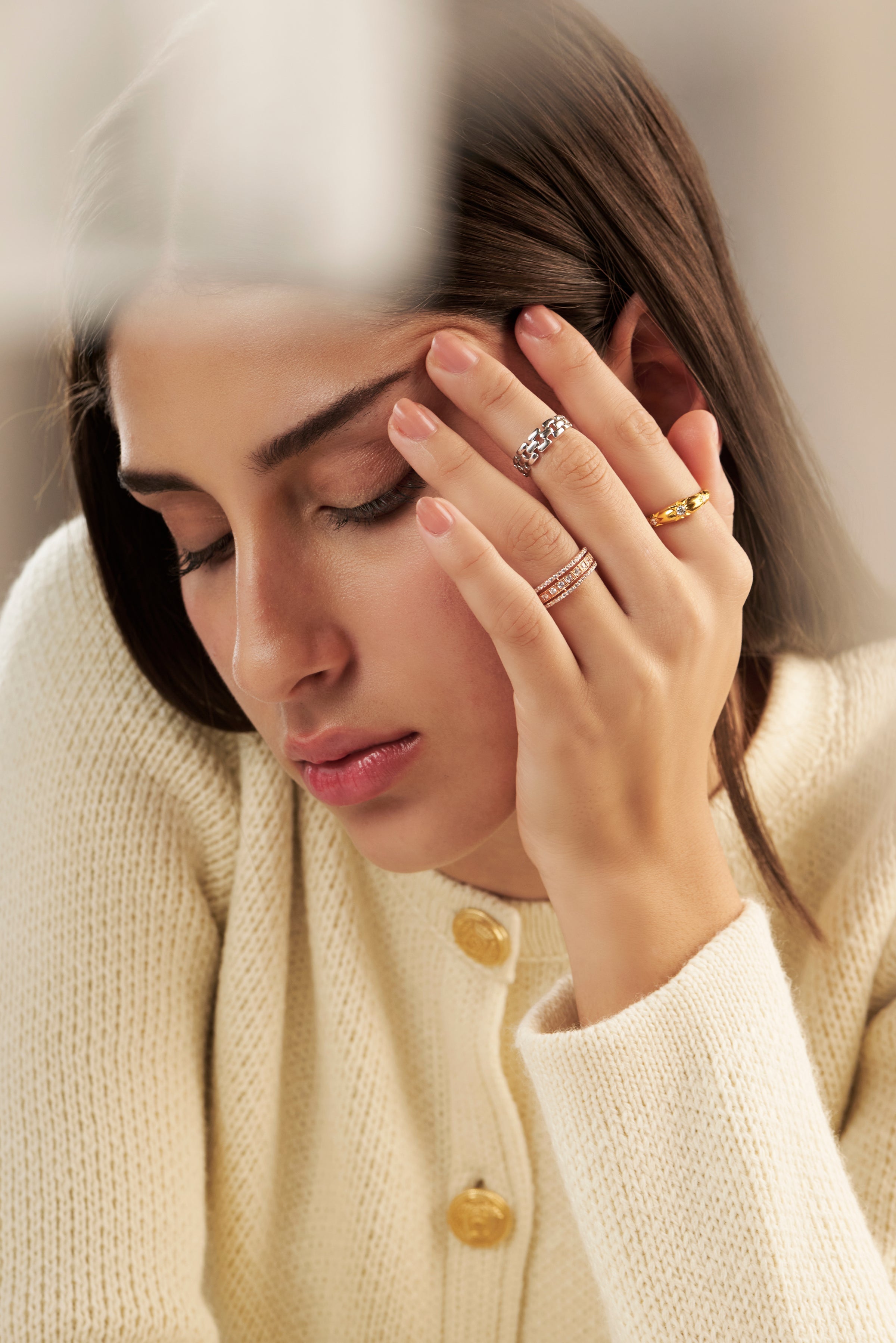 Hand-picked, premium zirconia stones placed delicately in the middle of the three star shapes. It is a dome-shaped ring, with the curved edge on a height.